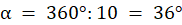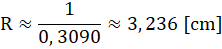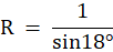 Dziesięciokąt foremny wpisany w okrąg składa się z dziesięciu przystających trójkątów, których ramiona są promieniami okręgu opisanego na tym dziesięciokącie. Promień okręgu opisanego oznaczasz jako R, natomiast kąt między promieniami, które są ramionami trójkąta, jest równy α. Wykorzystując funkcję sinusa, obliczasz długość R.