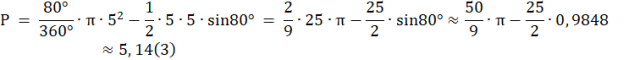 Pole zacieniowanej figury jest równe różnicy wycinka koła o promieniu równym 80° i trójkąta równoramiennego o bokach równych 5 i kącie między nimi równym 80°.