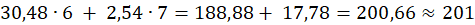 W tym zadaniu przedstaw długość wynoszącą 6 stóp i 7 cali w centymetrach. Wykorzystaj wzór: 30,48S + 2,54C.