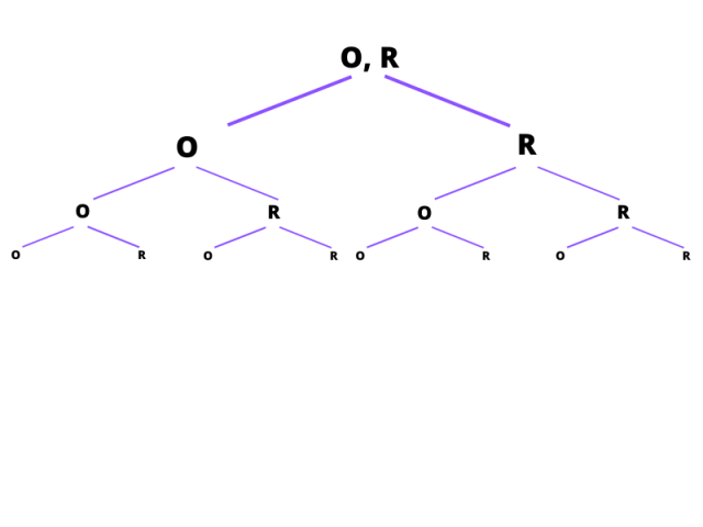 8 możliwości: {(O, O, O), (O, O, R), (O, R, O), (O, R, R), (R, O, O), (R, O, R), (R, R, O), (R, R, R)}