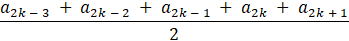 Jeśli środkowy wyraz ma mieć numer (2k – 1), to pięć kolejnych wyrazów tego ciągu będzie miało kolejno numery: (2k – 3), (2k – 2), (2k – 1), 2k, (2k + 1).