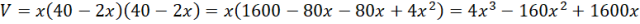 Zapisz w postaci sumy algebraicznej wzór opisujący pojemność pudełka, jeśli z kwadratowego arkusza tektury o boku równym 40 cm wycięto w rogach kwadraty o boku