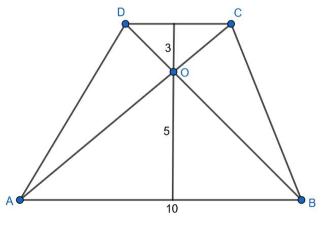 Wyznacz pola trójkątów, na które przekątne dzielą trapez, jeśli jego dłuższa podstawa ma długość 10, a punkt przecięcia przekątnych tego trapezu jest odległy o 5 cm od jego dłuższej podstawy i o 3 cm – od krótszej.