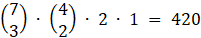 Oblicz, na ile sposobów można wybrać 3 miejsca spośród 7 na literę K, następnie 2 z 4 pozostałych na U oraz po jednym z pozostałych miejsc dla pozostałych liter. Otrzymasz wówczas