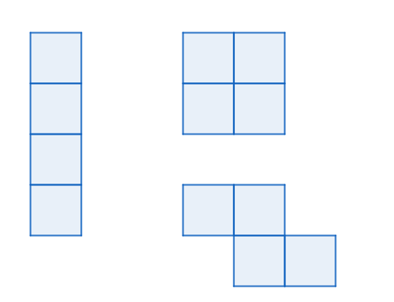 W tym zadaniu narysuj trzy różne figury środkowosymetryczne zbudowane z czterech przystających kwadratów.