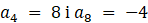 Najpierw wyznacz q, korzystając z podanych wartości. Zauważ, że iloraz między 8. i 4. wyrazem ciągu geometrycznego wynosi q4, dla którego zachodzi sprzeczność, ponieważ parzysta potęga liczby nie może być ujemna.