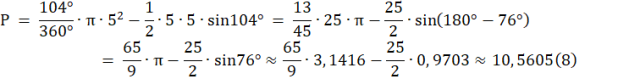 Pole zacieniowanej figury jest równe różnicy wycinka koła o promieniu równym 104° i trójkąta równoramiennego o bokach równych 5 i kącie między nimi równym 104°. Dany trójkąt równoramienny tworzymy poprzez dorysowanie dodatkowego promienia do prawego końca zacieniowanej figury.