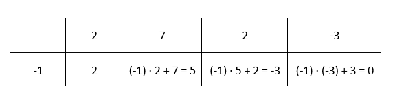 Narysuj tabelę i w pierwszym wierszu wpisz współczynniki przy kolejnych potęgach wielomianu W(x), zaś w pierwszej komórce wiersza drugiego wpisz współczynnik a. W tym przypadku wynosi on -1. Kolejne komórki w drugim wierszu będziesz uzyskiwał, przez przemnożenie poprzedniej komórki w drugim wierszu przez a, a następnie dodanie zawartości komórki w wierszu powyżej. Drugą komórkę w drugim wierszu uzupełniasz przez przepisanie wartości wyżej.