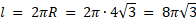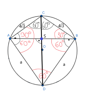 W okrąg wpisano dwa trójkąty równoramienne, ABC i ABD, które mają wspólną podstawę AB (jak pokazano na rysunku). W trójkącie ABC, kąt między ramionami o długości 4√3 cm wynosi 120. Oblicz: długość okręgu.