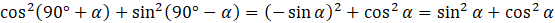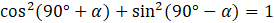 Wykaż, że cos2(90° + α) + sin2(90° - α) = 1.