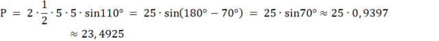 Pole zacieniowanej figury jest równe sumie pól dwóch przystających trójkątów równoramiennych o bokach równych 5 i kątach między nimi równych 110°. Trójkąty można utworzyć, prowadząc promień koła do jednego z wierzchołków zacieniowanej figury.
