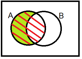 Na diagramie zakoloruj A bez B (zielony) oraz zakreskuj A (czerwone kreskowanie), a następnie znajdź różnicę obu zbiorów (zielone niezakreskowane).
