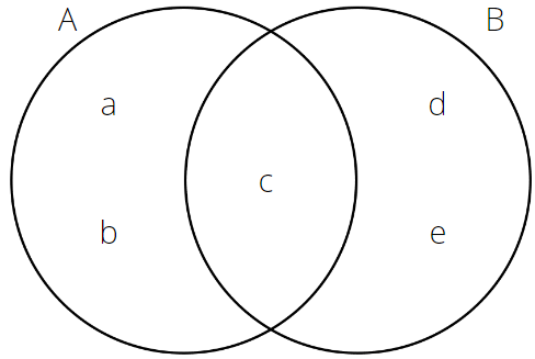 Jeden element musi należeć do części wspólnej obu zbiorów, a po dwa elementy tylko do zbioru A i zbioru B.