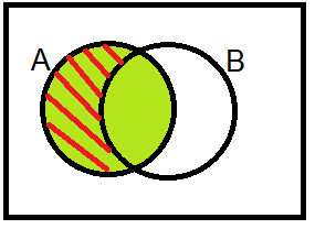 Na diagramie zakoloruj A (zielony) oraz zakreskuj A bez B (czerwone kreskowanie), a następnie znajdź różnicę obu zbiorów (zielone niezakreskowane).