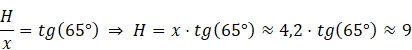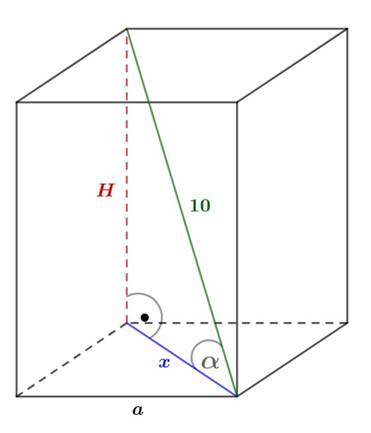 Przekątną podstawy (x) oraz wysokość prostopadłościanu (H) wyznacz z zależności trygonometrycznych w trójkącie prostokątnym. Następnie ze wzoru