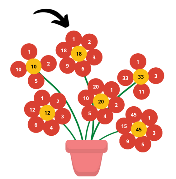Rozpocznij od wypisania dzielników dla każdej z liczb znajdujących się w żółtym kółku, następnie policz sumę dzielników dla każdego kwiatka i wskaż tego, którego suma dzielników wynosi 39.
