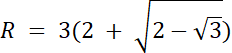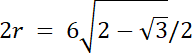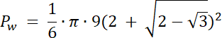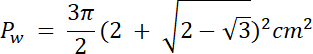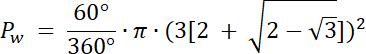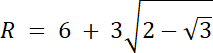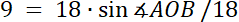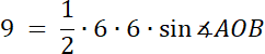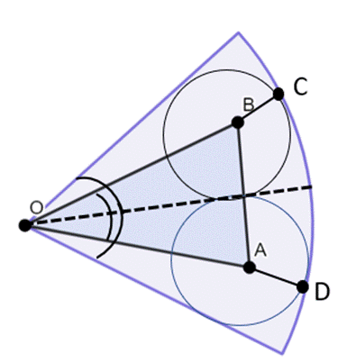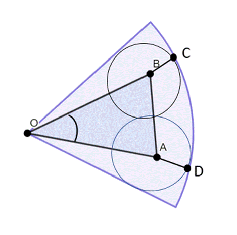 Na początku wyznacz kąt w trójkącie AOB, który leży naprzeciwko boku AB–wykorzystaj wzór na pole trójkąta z funkcją sinus. Następnie bok |AB| = 2r, gdzie r to długość promienia okręgu A oraz okręgu B. Kąt ∡O = 2|∡AOB|–z twierdzenia o kącie środkowym i wpisanym. Wyznacz na tej podstawie wartość promienia r. Zauważ, że promień wycinka okręgu jest równy |OD|, a |OD| = |OA| + |AD|, wyznacz z tego zapisu długość promienia R, a na koniec oblicz pole wycinka.