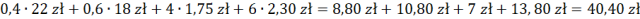 Na początku oblicz cenę zakupów – zsumuj ze sobą ilości produktów pomnożone przez ich cenę. Pamiętaj, aby zamienić dekagramy na kilogramy, ponieważ w poleceniu podano cenę za kilogram. Następnie odejmij cenę zakupów od 50 zł, aby obliczyć wydaną resztę.