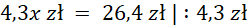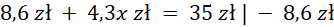 50% ceny początkowej jest równe 50% ∙ 8,6 zł = 4,3 zł. Układamy równanie, w którym uwzględniamy już, że zapłaciliśmy 8,6 zł za pierwszy szampon i mnożymy 4,3 zł przez niewiadomą: