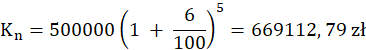 W tym zadaniu musisz obliczyć, o ile złotych obecna wartość mieszkania jest niższa od wartości, jakiej spodziewali się państwa Malinowscy, gdy pięć temu kupili mieszkanie za 500 000 zł i spodziewali się, że co roku jego wartość będzie wzrastała o 10% a w rzeczywistości jego wartość wzrastała o 6% rocznie.