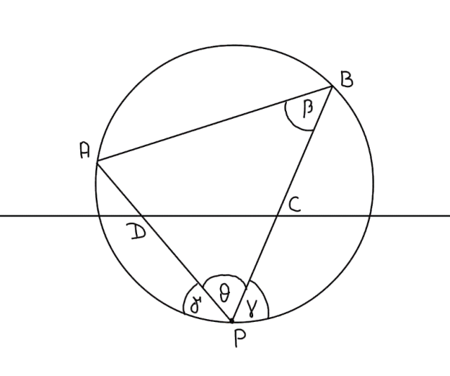 Udowodnij, że na czworokącie ABCD można opisać okrąg, jeżeli powstał on w wyniku odcięcia jednego rogu trójkąta prostą równoległą do stycznej poprowadzonej przez wierzchołek. Popatrz na rysunek obok.