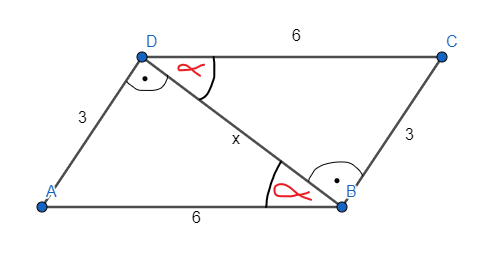 Zarówno trójkąt ABD jak i trójkąt DBC mają boki długości 3, 6 i x, więc są przystające na podstawie cechy bok bok bok.