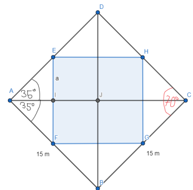 Planuje się stworzenie kwadratowego klombu na trawniku w kształcie rombu o boku długości 15 m i kącie ostrym α = 70°. Projekt zakłada, że naroża klombu będą dotykać brzegów trawnika oraz że bok EH będzie równoległy do boku BD. Czy powierzchnia klombu będzie większa niż 1 ar?
