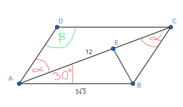 W podanym równoległoboku ABCD bok AB ma długość 5√3, a bok AC ma długość 12. Kąt CAB wynosi 30°. Oblicz miary kątów tego równoległoboku.