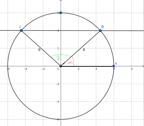 Na płaszczyźnie wyznaczono koło o środku w punkcie O(0, 0) i promieniu 6. Następnie narysowano prostą, której równanie brzmi y = 4 (zobacz rysunek). Twoim zadaniem jest przybliżone określenie miary kąta AOB oraz kąta AOC.