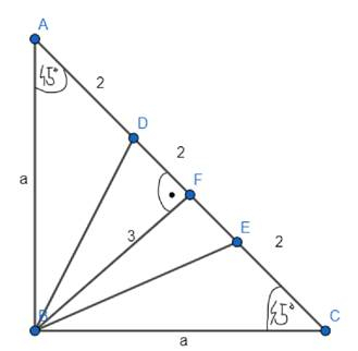 Przeciwprostokątna została podzielona na trzy odcinki o równej długości, więc każdy z odcinków |AD|, |DE|, |EC| ma długość 2. Odcinek |FB| jest wysokością poprowadzoną z wierzchołka kąta prostego w trójkącie równoramiennym, więc jego długość będzie równa połowie przeciwprostokątnej i będzie wynosiła 3. Oblicz długość a z twierdzenia Pitagorasa w trójkącie ABC. Oblicz długość |BD| z twierdzenia Pitagorasa w trójkącie BDF. Oblicz tangens kąta