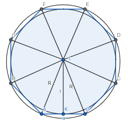 . Następnie skorzystaj z twierdzenia Pitagorasa w trójkącie AKL i wyznaczonej wcześniej zależności R od r, aby obliczyć długość boku a.
