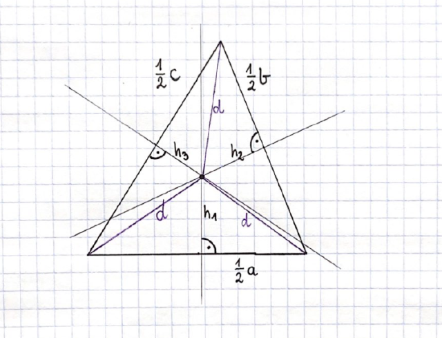 W tym zadaniu oblicz jakie są odległości punktu d od poszczególnych boków trójkąta wiedząc, że boki trójkąta ostrokątnego mają długości a, b i c, a symetralne boków przecinają się w punkcie, którego odległość od wierzchołków trójkąta jest równa d.