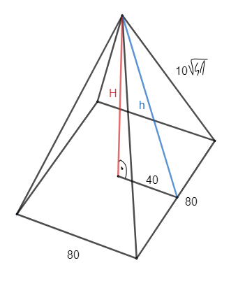 Wyznacz pole powierzchni całkowitej i objętość ostrosłupa prawidłowego czworokątnego, którego krawędź podstawy ma długość 80, a krawędź boczna wynosi