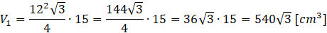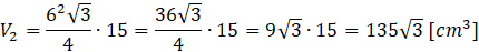 Oblicz objętość graniastosłupa o długości krawędzi podstawy równej 12 cm i wysokości 15 cm, następnie oblicz objętość graniastosłupa o długości krawędzi podstawy równej 6 cm i wysokości 15 cm. Kolejno wykonaj odejmowanie, aby obliczyć objętość elementu. Na koniec wyznacz masę elementu.