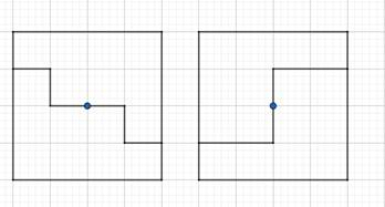 Kwadrat na rysunku obok podzielono na dwie przystające części linią mającą środek symetrii i biegnącą wzdłuż brzegów kratek. Musisz znaleźć co najmniej dwa inne sposoby podziału kwadratu na dwie przystające części linią spełniającą te warunki.
