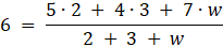 Dany jest zbiór 5, 4, 7 o wagach odpowiednio 2, 3 w. Jego średnia jest równa 6, znajdź w.