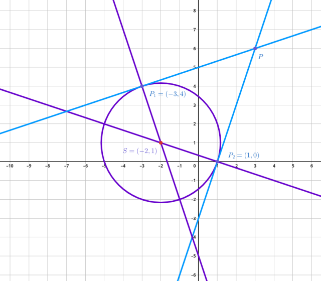 Równanie prostej stycznej do okręgu przechodzącej przez punkt 𝑃₂ ma postać: