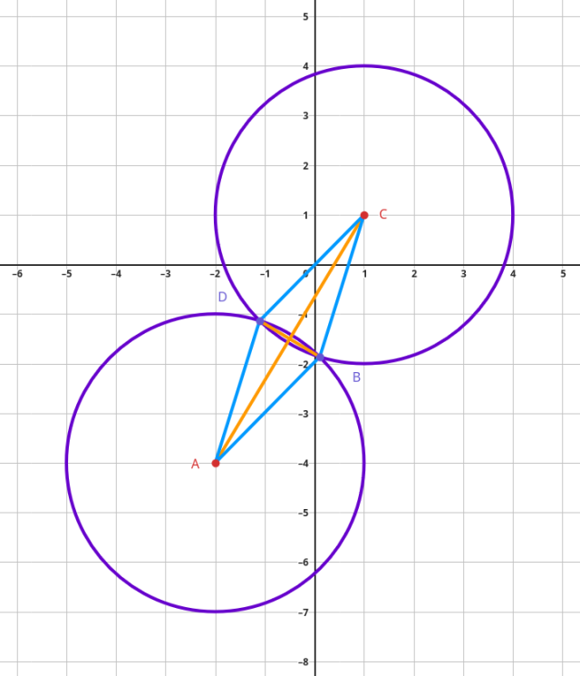 Zauważ, że boki czworokąta to promienie okręgów o długości 3. Czworokąt 𝐴𝐵𝐶𝐷 jest więc rombem.