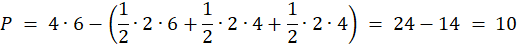 Zauważ, że aby obliczyć pole tego trójkąta musisz od całego pola prostokąta odjąć trzy pola trójkątów prostokątnych: