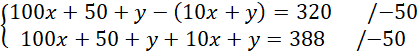 Znajdź liczby A i B, jeśli dana jest trzycyfrowa liczba A o cyfrze dziesiątek równej 5, po usunięciu tej cyfry otrzymujemy dwucyfrową liczbę B, zaś różnica liczb A i B wynosi 320, a suma liczb A i B jest równa 388.