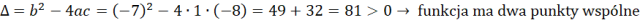 Musisz obliczyć wartość delty oraz na jej podstawie ilość punktów wspólnych funkcji f(x) z osią x (miejsc zerowych funkcji).