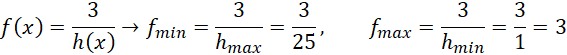 Musisz obliczyć wartości maksymalne i minimalne funkcji w mianowniku funkcji f, a następnie obliczyć te wartości dla funkcji f.
