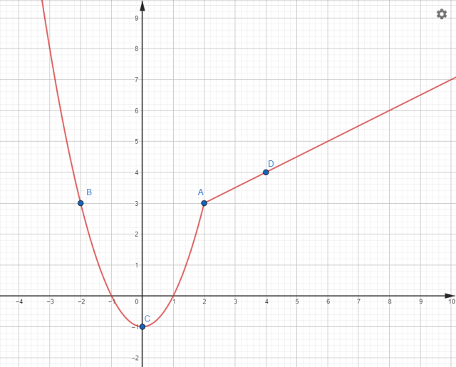 Musisz obliczyć wartości funkcji w dowolnych punktach dla każdego z przedziałów oraz na ich podstawie narysować wykres złożony.