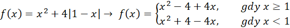 Musisz przekształcić zapis funkcji za pomocą nawiasu przypadków dla konkretnych przedziałów, obliczyć wartości funkcji w dowolnych punktach dla każdego z przedziałów oraz na ich podstawie narysować wykres złożony.