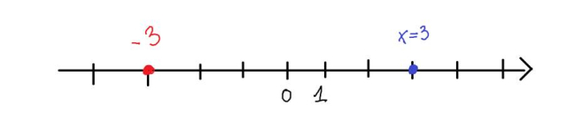Na niebiesko zaznaczona jest liczba x =3, a na czerwono liczba do niej przeciwna.