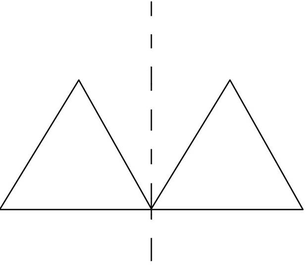 Narysuj figurę złożoną z dwóch przystających trójkątów równobocznych tak, by otrzymana figura miała oś, wzdłuż której dwie połowy figury pokryją się idealnie ze sobą po złożeniu.