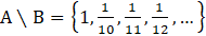 Zbiór A jest nieskończony, ponieważ ma 3 kropki na końcu po przecinku, które oznaczają następne wyrazy. Możesz wypisać parę wyrazów, aby łatwiej było wyznaczyć różnicę zbiorów. Następnie odrzuć ze zbioru A, wszystkie wyrazy, które znajdują się w zbiorze B. Będą nimi