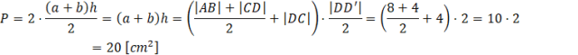Wyznacz pole figury będącej częścią wspólną trapezów ABCD i A’B’C’D, które są wzajemnie symetryczne względem prostej zawierającej środki ramion AD i BC, gdzie dane są długości |AB| = 8 cm, |CD| = 4 cm, |AD| = |BC| =