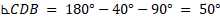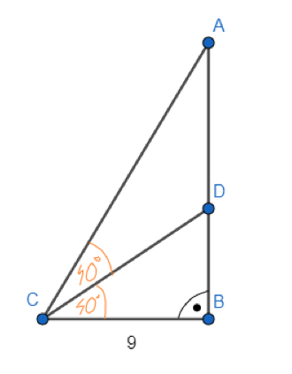 Mamy trójkąt ABC, którego kąt ACB wynosi 90°, a kąt CBA wynosi 80°. Długość boku BC wynosi 9. Rozwiąż trójkąt CBD, w którym punkt D leży na boku AC, a odcinek BD jest zawarty w dwusiecznej kąta CBA.