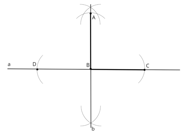 Zacznij od narysowania prostej a i zaznacz na niej punkt B. Następnie zmierz za pomocą cyrkla długość odcinka BC na rysunku w podręczniku. Nie zmieniając rozwartości cyrkla, wbij go w zaznaczony wcześniej punkt B i zakreśl dwa łuki na prostej a. Miejsca przecięcia łuków z prostą oznacz jako C i D. Punkt C będzie odpowiadał temu z podręcznika. Z punktów C i D zakreśl dwa łuki, pod i nad odcinkiem DC (rozwartość cyrkla powinna być większa niż połowa długości odcinka DC). Poprowadź prostą b przez miejsca przecięcia narysowanych łuków. Zmierz za pomocą cyrkla długość odcinka AB na rysunku w podręczniku. Nie zmieniając rozwartości cyrkla, wbij go w zaznaczony punkt B i zakreśl łuk na prostej b nad punktem B. Miejsce przecięcia łuku z prostą b będzie odpowiadało punktowi A z podręcznika. Po połączeniu punktów A i B oraz B i C powstanie rysunek taki sam, jak ten w podręczniku.